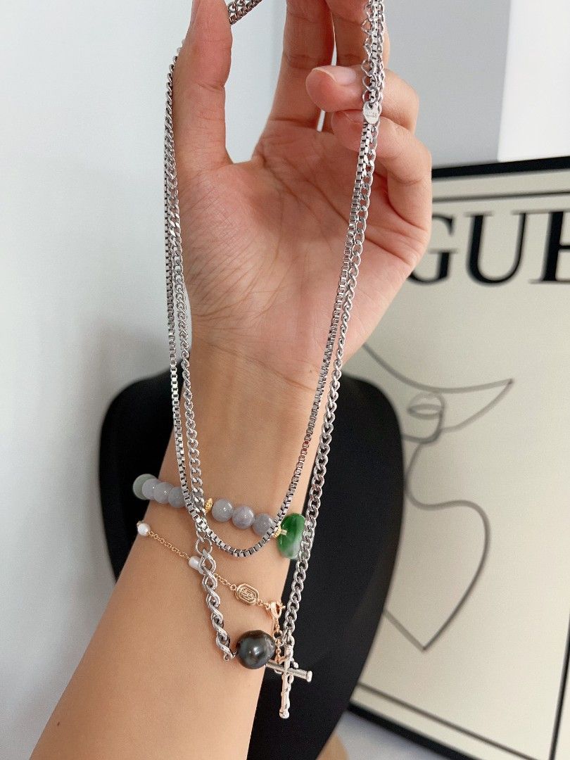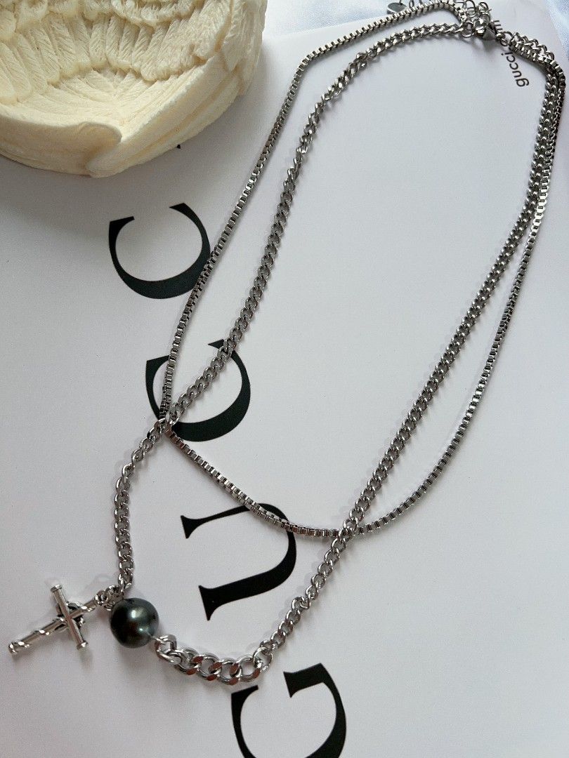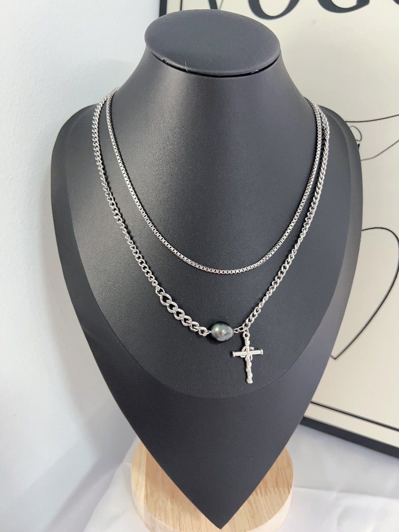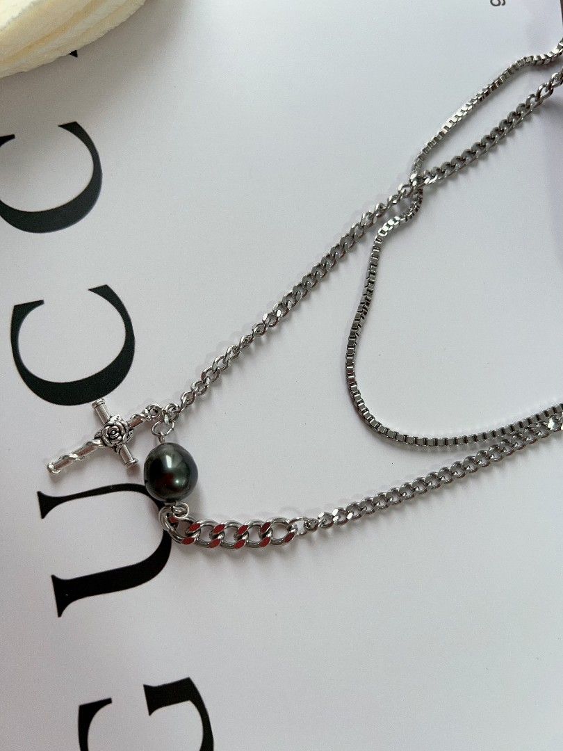 #PN1176 Saltwater Pearl Necklace| Tahitian| Cross Pendant|2-layer Chain Necklace| Clean & Cool Design| Minimalism