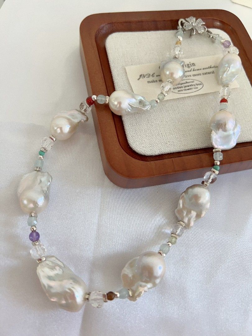 #PN1156 Freshwater Pearl Necklace & Earrings Set| Cold Silver Lustre Fishtail Baroque Pearl| Agate, Aquamarine, Amethyst| Fresh Breeze in Summer| New Design| S925 Spacers