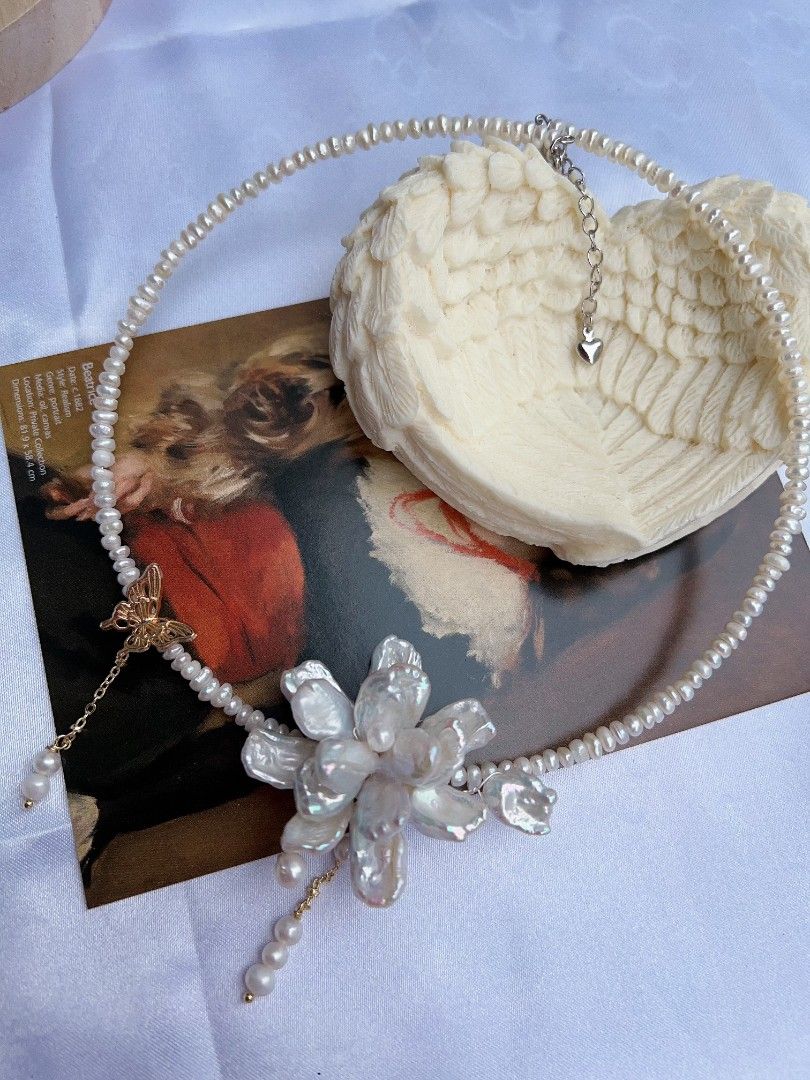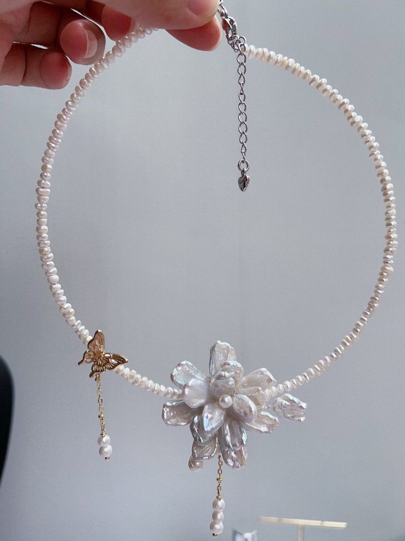 #PN1162 Freshwater Pearl Necklace| Collar|2-layer Petal Flower| Cold Blue Silver Lustre| Dangling|Retro| Niche| Temperament| Light Luxury| OOAK