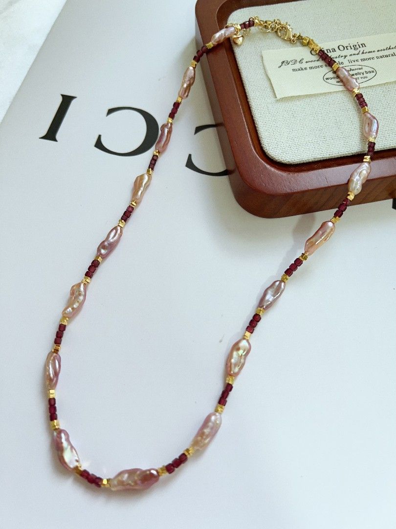 #PN1163 Freshwater Pearl Necklace| Garnet Mini Square|Lustrous Keshi Pearl| Christmas Gift 💐