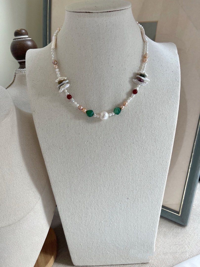 #PN724 Freshwater Pearl Necklace & Bracelet Set | Lute Shaped Pearl | Green Agate| Big Wrinkle Baroque | Baby Pearl | Colourful Life
