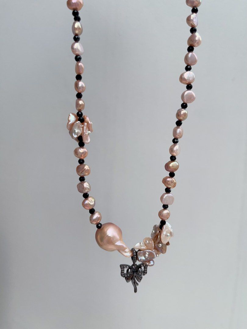 #PN897[Floral Series] Freshwater Pearl Necklace | Dark Lolita | Gothic Style| Petals, Fishtail Baroque | Spinel| Black Butterfly Pendant | Mood Changer