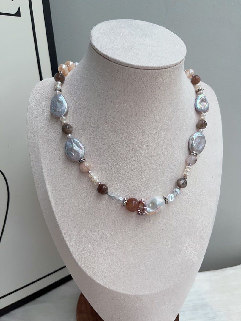 #PN914 Freshwater Pearl Necklace | Electro-treated Grey Colour Pancake Shaped Baroque | Blue-golden Wrinkle Baroque | Moonstone| Fire Quartz | Baby Purple Pearl Ring| Give A Taste of History