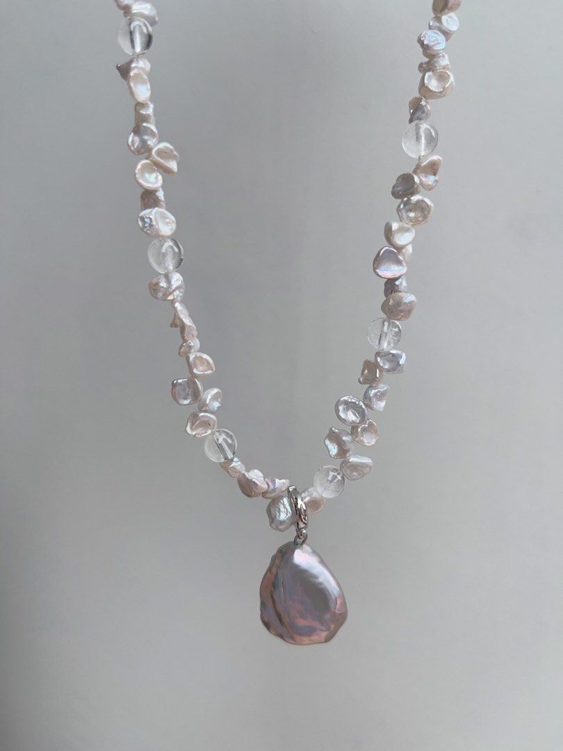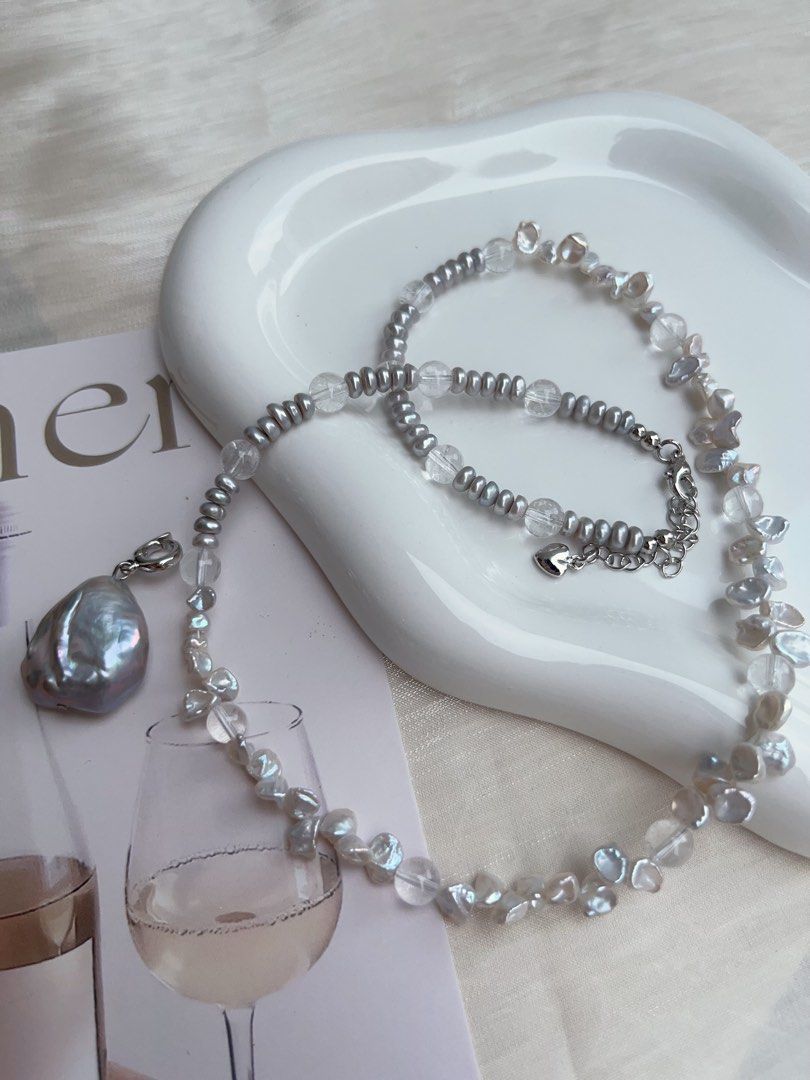 #PN917 Freshwater Pearl Necklace | Lustrous Petals | Clear Quartz | Treated Colour-Grey Baby Pearl| Grey Pendant | Removable Big Petal Pendant | Elegance Never Fade Away