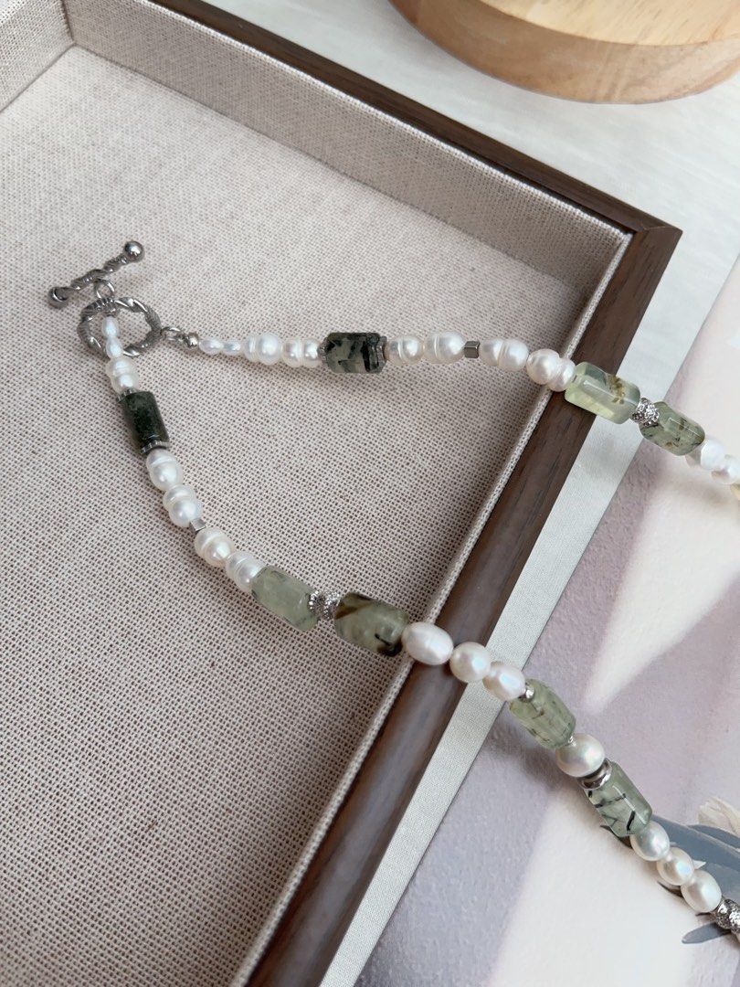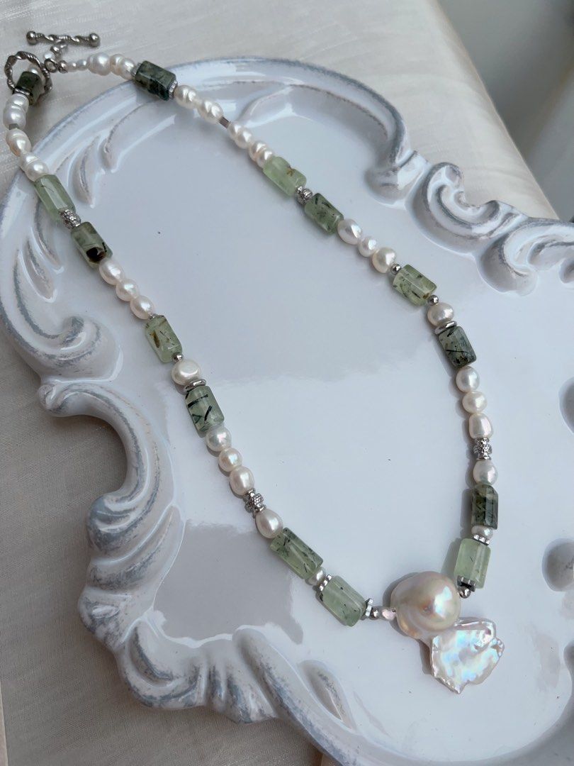 #PN957 Freshwater Pearl Necklace | Prehnite Barrel | White Forest 🌳 | Hamburger 🍔 Baroque | Angel Shaped Baroque | 45cm| A Modern Twist on a Classic Gem