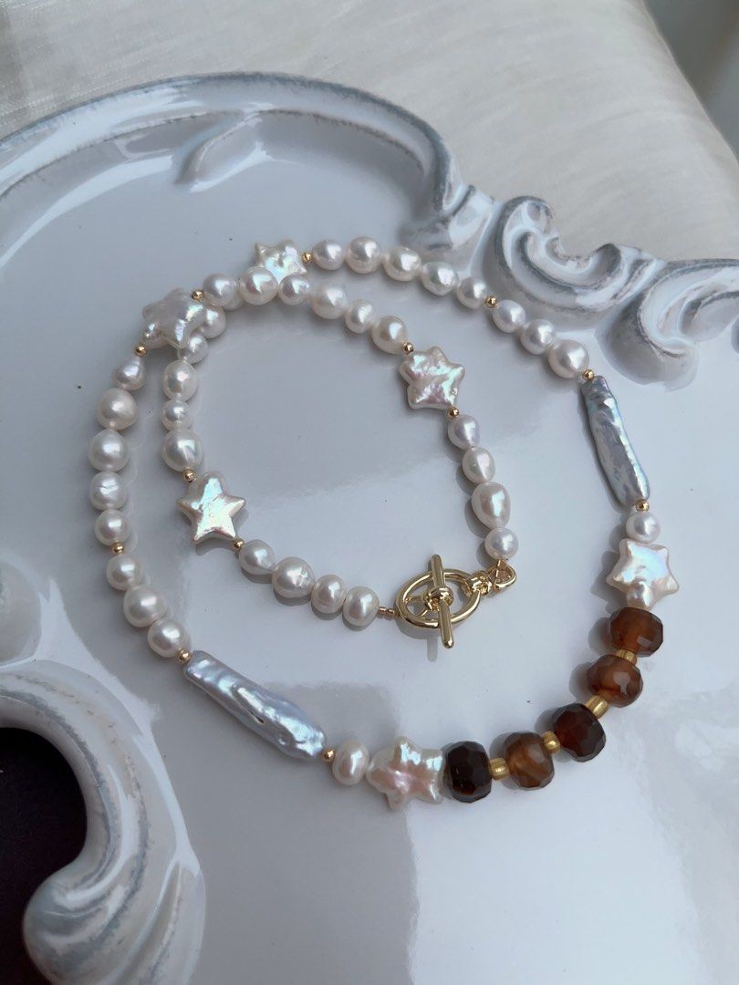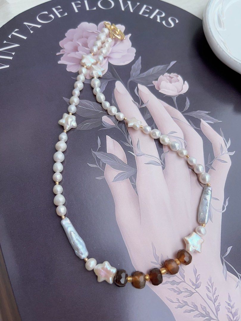 #PN958 Freshwater Pearl Necklace | Star Baroque | Brown Faceted Abacus Agate| Stick Pearl| 43cm| Minimal, Elegant, Unforgettable