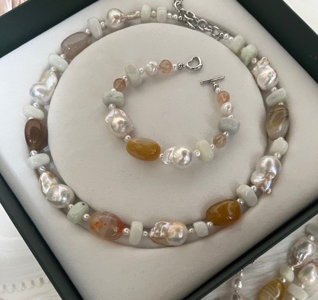 #PN978 Freshwater Pearl Necklace & Bracelet Set | Fishtail Baroque Pearl | Big Agate Freeform | Jade Block| Baby Pearl | Tender Power| Birthday Gift 💝