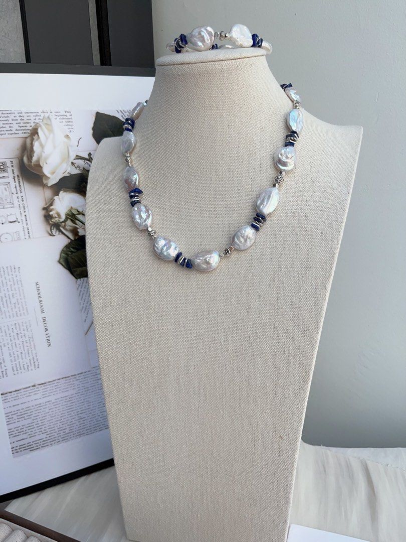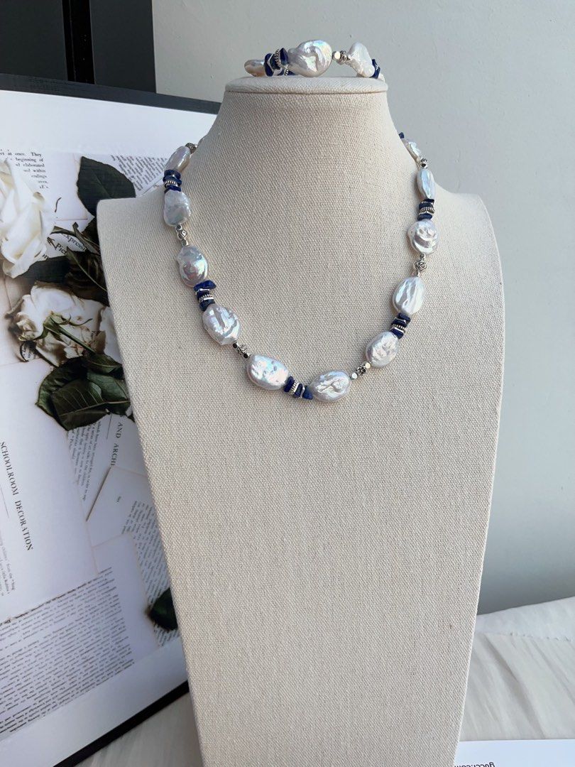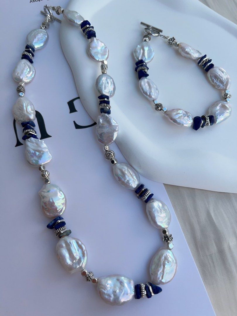 #PN995 Freshwater Pearl Necklace & Bracelet Set | Lustrous Oval Baroque | Lapis Lazuli Chips| 42cm| 20cm| Can Connect to Wear| Calm Klein Blue
