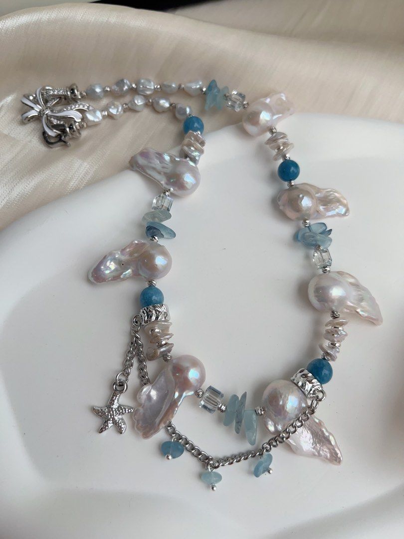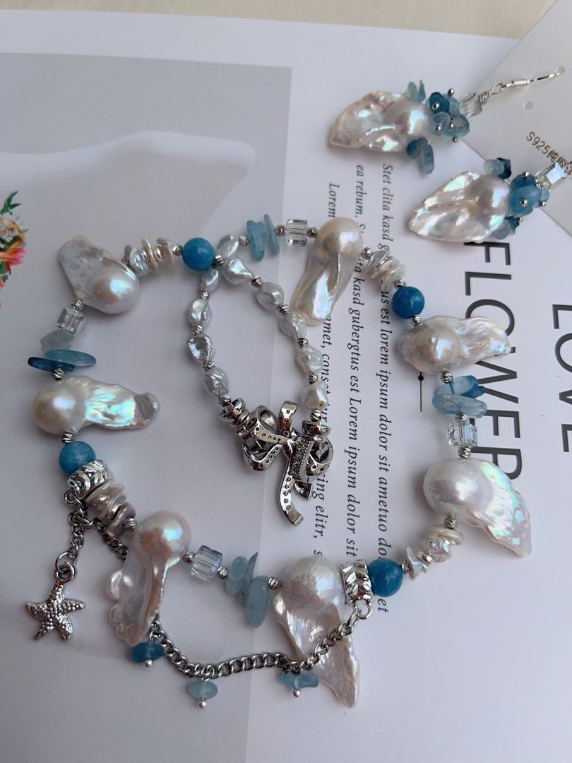 #PN1012 Freshwater Pearl Necklace & Earrings Set| Heart of the Ocean| Fishtail Baroque | Aquamarine Chips| Blue Apatite | Petals| 43cm| Modern Classic