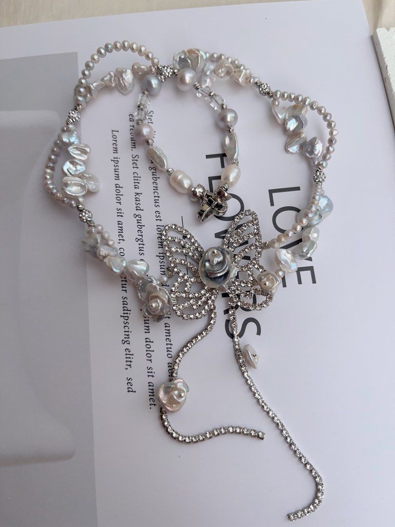 #PN1016 Freshwater Pearl Necklace | Flying Butterfly 🦋 | Silver-blue Pearl Stone| Baby Pearl Lace| 42cm| Big Butterfly | Dangling Shining | Everyday Luxury