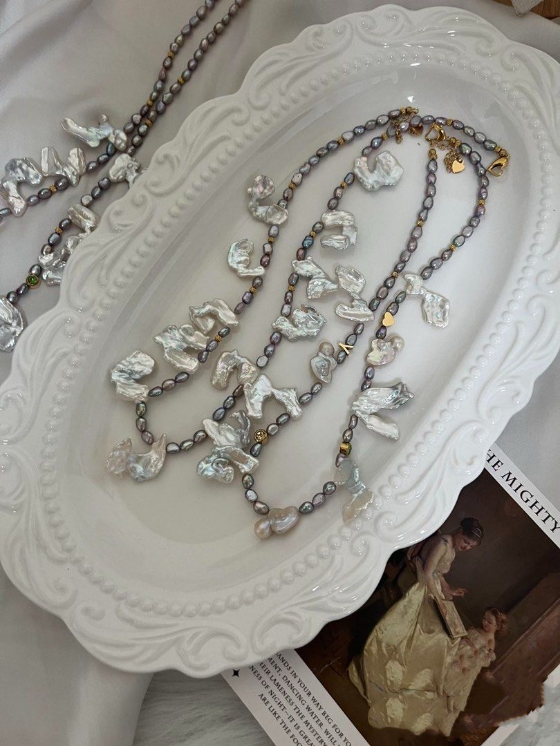 #PN798 Freshwater Pearl Necklace| Blue-Silver Lustrous Fusion Character Petals| Metallic Rice Pearl | Add to Cart Worthy