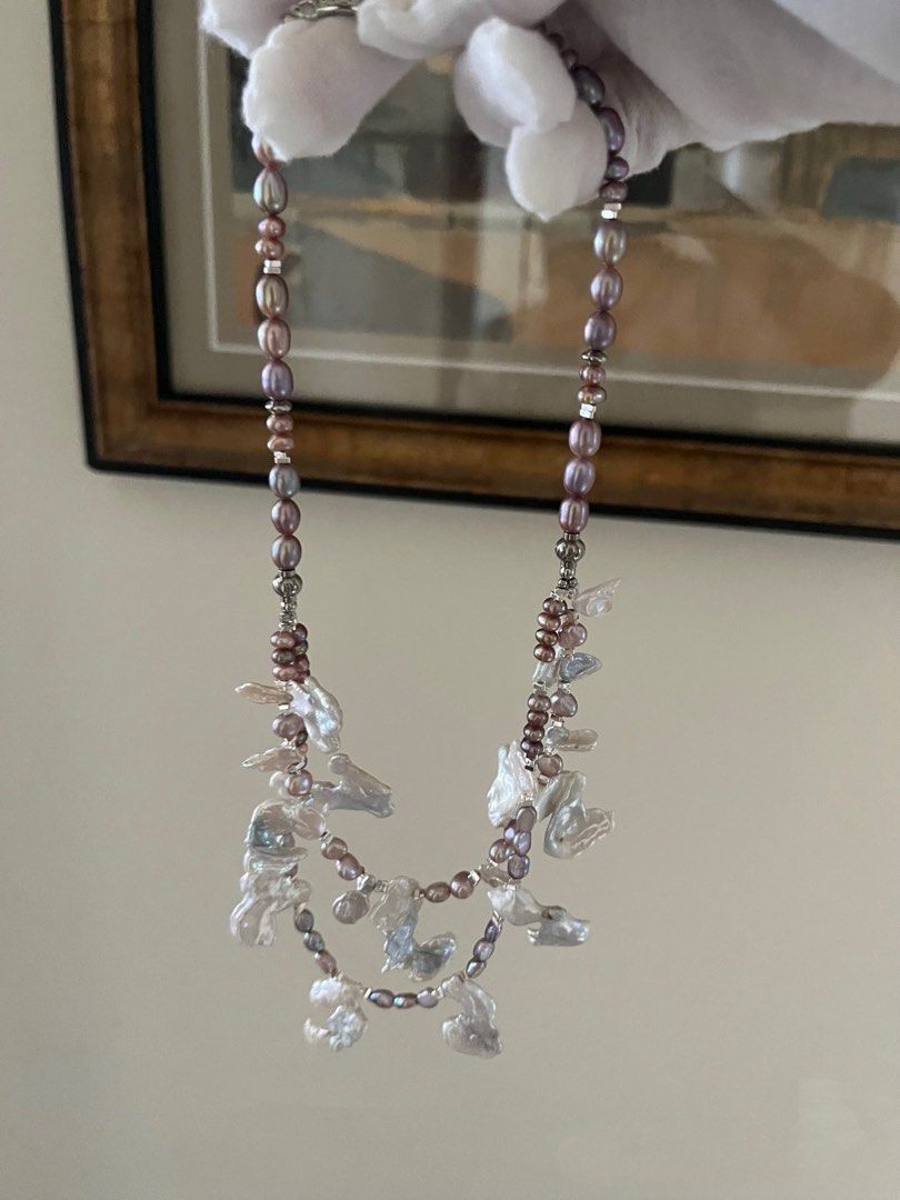 #PN817 Freshwater Pearl Necklace | Double Layered | Character Petal Baroque Blue Silver Lustre | Inner Round 42cm| Metallic Rice Pearl | Wedding 💝