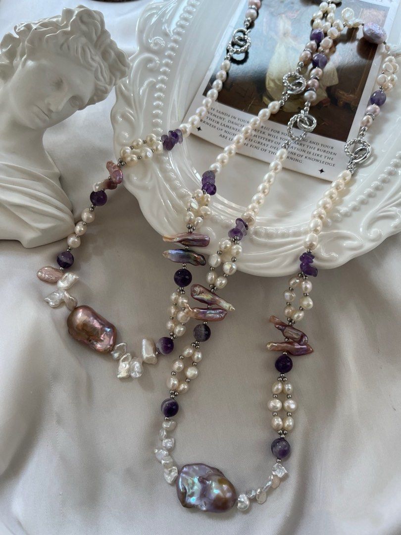 #PN828 Freshwater Pearl Necklace & Bracelet Set | Can Connect to Wear|Oil Painting Fishtail Baroque | Braided 2-layer | Amethyst | Lute Pearl | Just the Right Amount