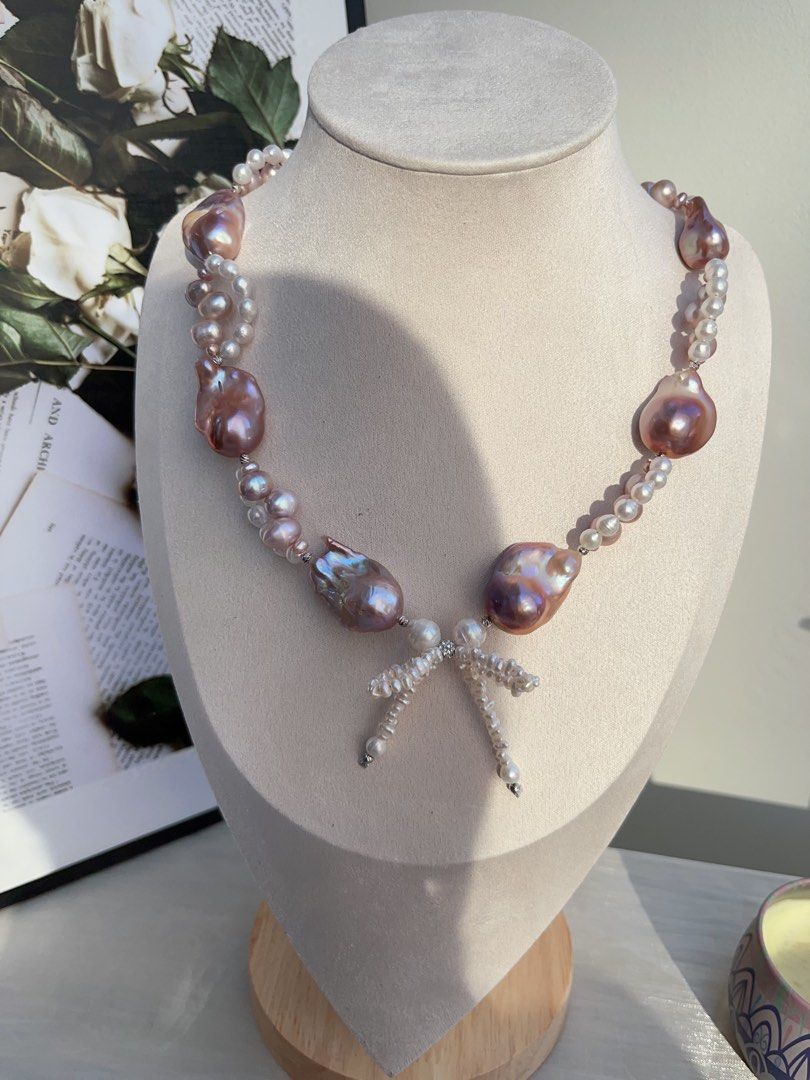 #PN845 Freshwater Pearl Necklace | Purple Fishtail Baroque |Lace Design| Lustrous | Bow Tie Structure | For Special Event