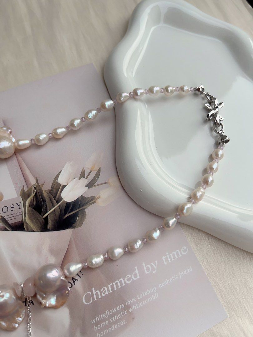 Note: the pink mini beads in between the white rice pearls are artificial beads.