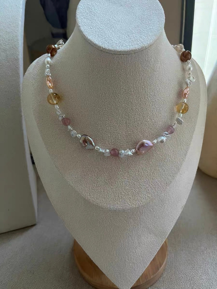 #PN1192 Freshwater Pearl Necklace Fire Quartz Citrine Black Gold Super 7 Strawberry Quartz Opal Removable Pendant Petal Baroque Lustrous