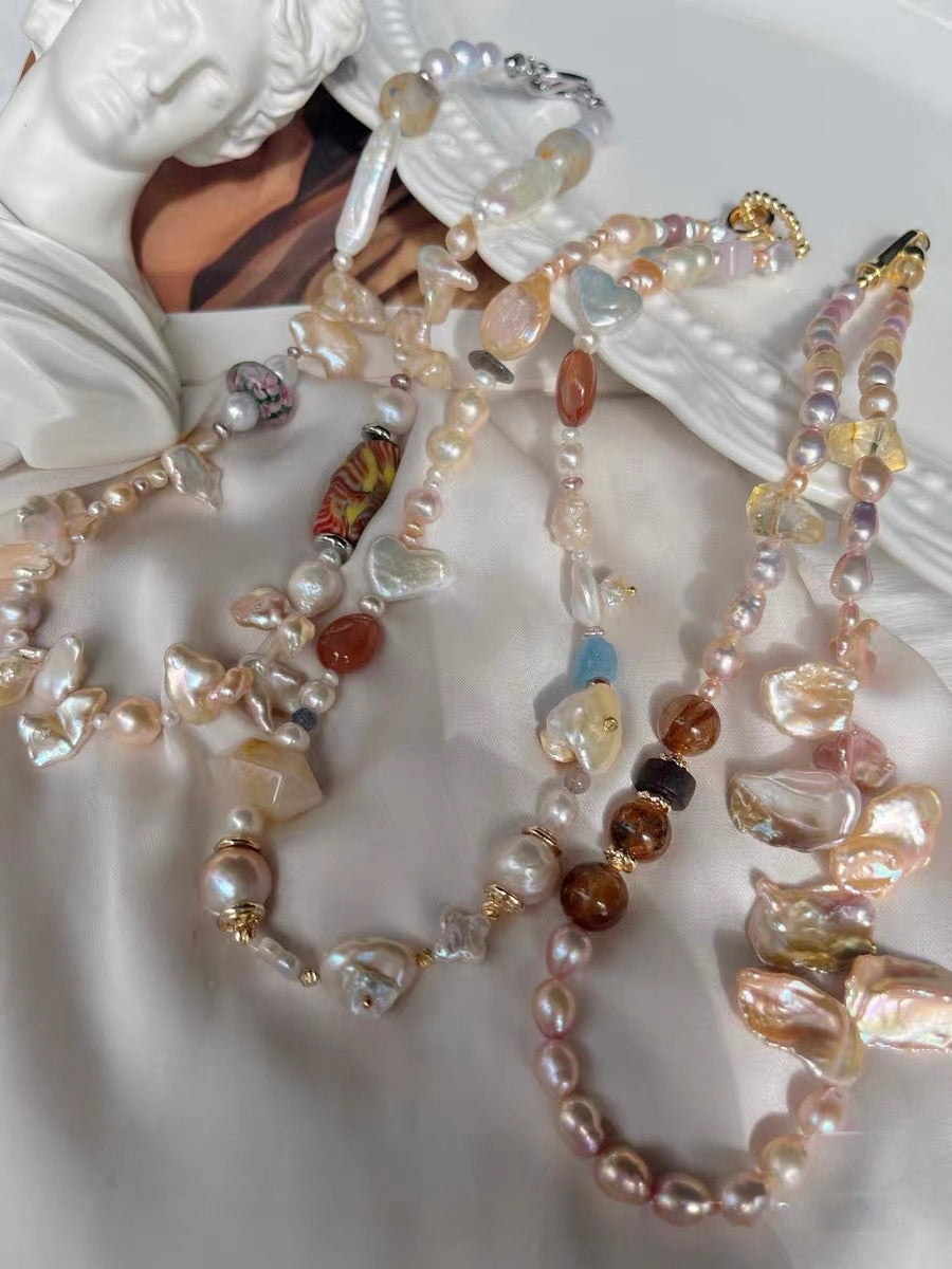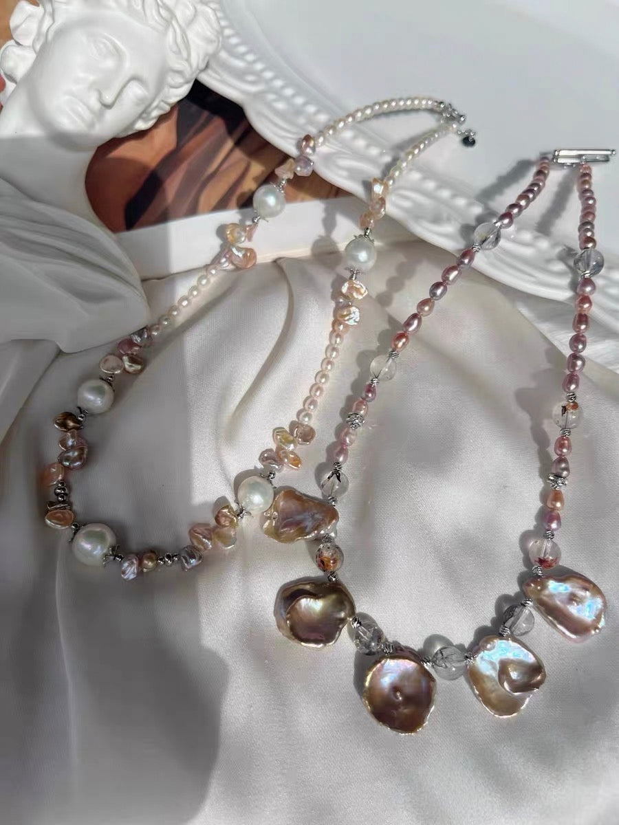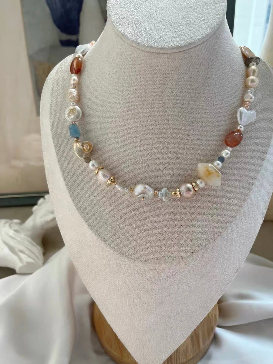 #PN1194 Freshwater Pearl Necklace prehnite aquamarine agate herkimer vintage brown petals fishtail baroque