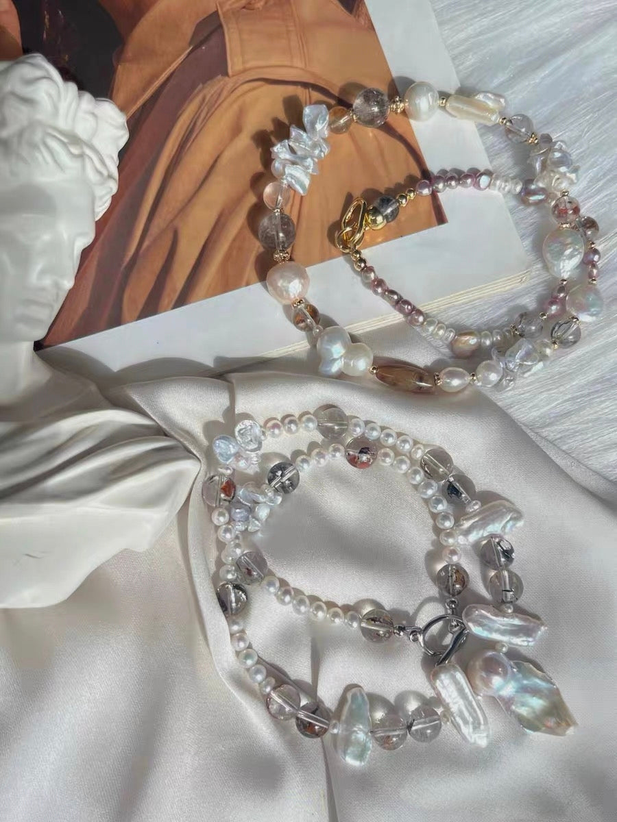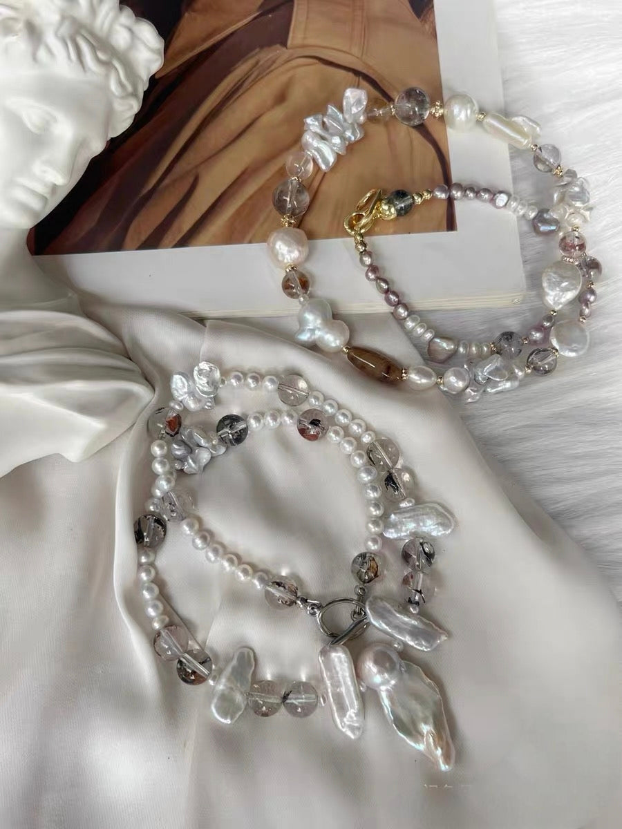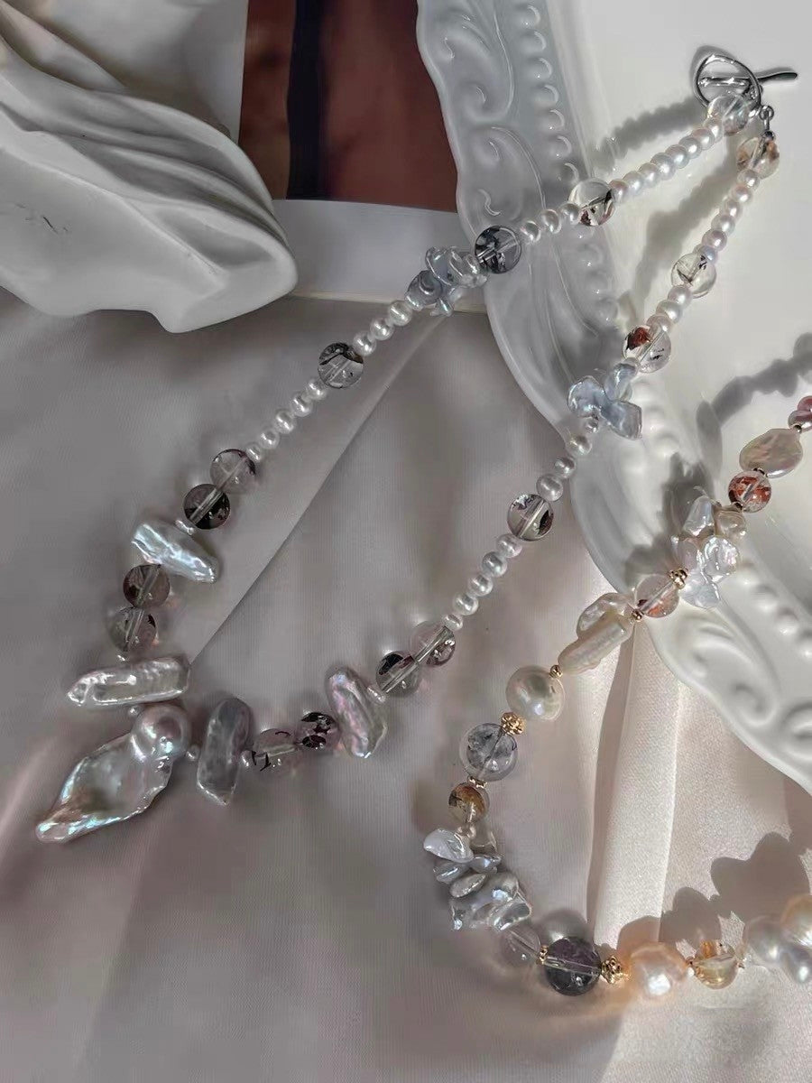 #PN1197 freshwater pearl necklace irregular baroque fishtail silver blue lustre herkimer agate coin pearl