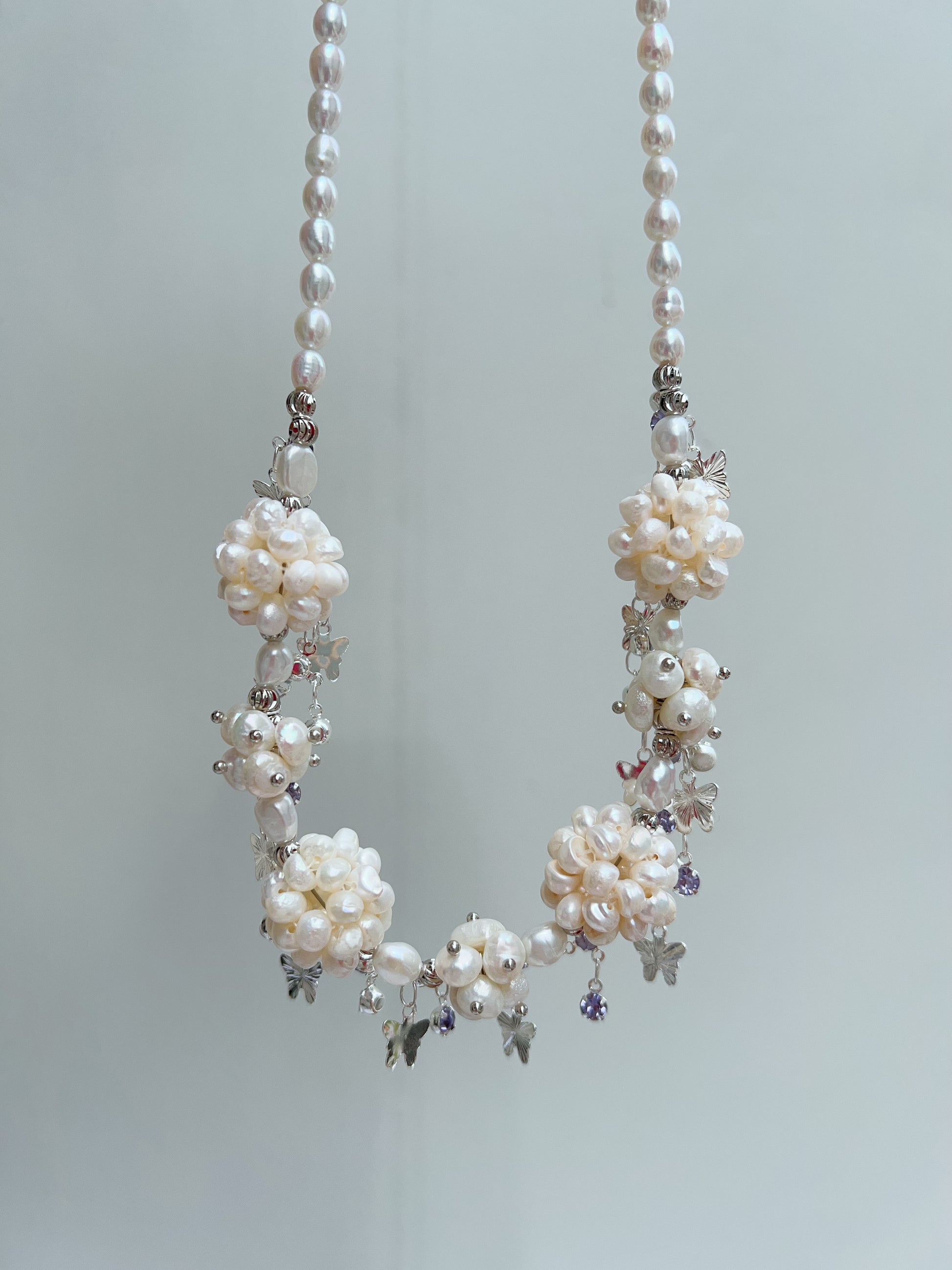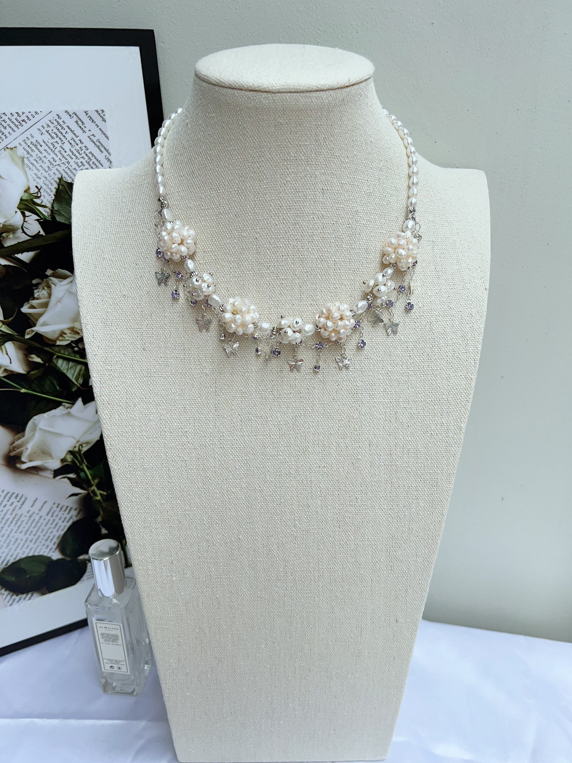 #PN1205 freshwater pearl necklace white flower ball butterfly on chain natural flaws wedding style