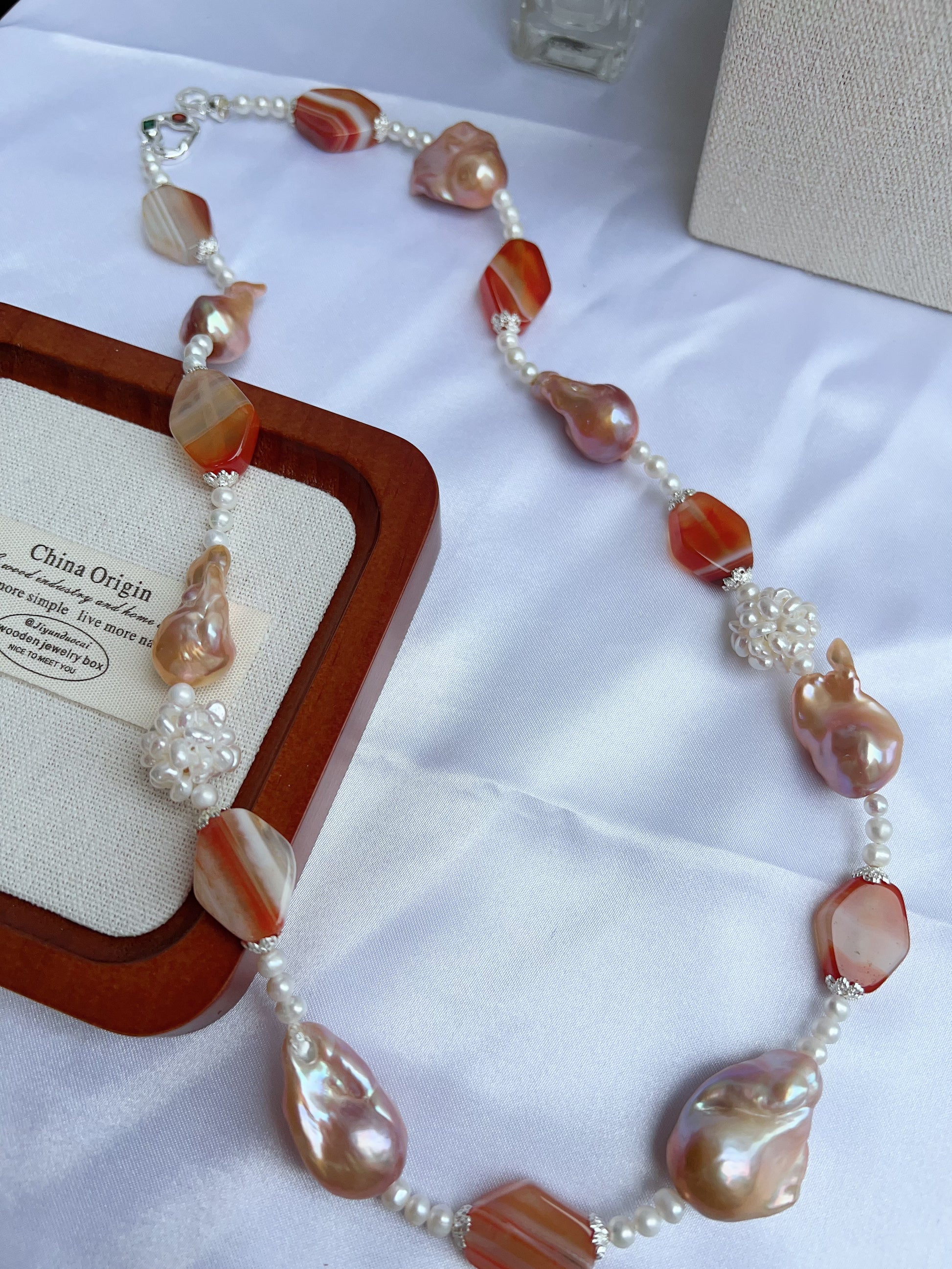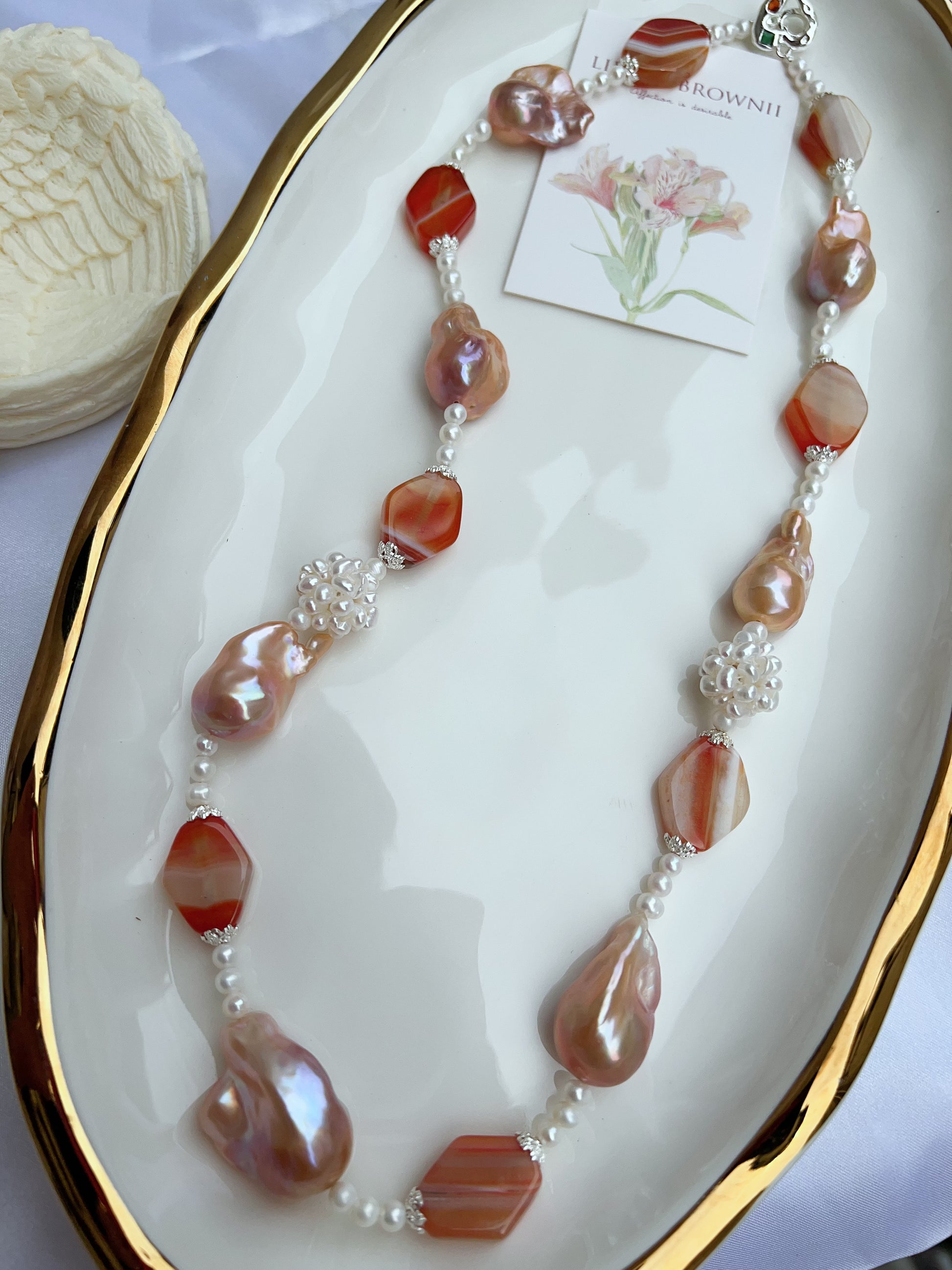 #PN1207 freshwater pearl necklace Afterglow of the setting sun pearl flower ball lustrous pink-golden fishtail baroque and agate pretty color palette 58cm