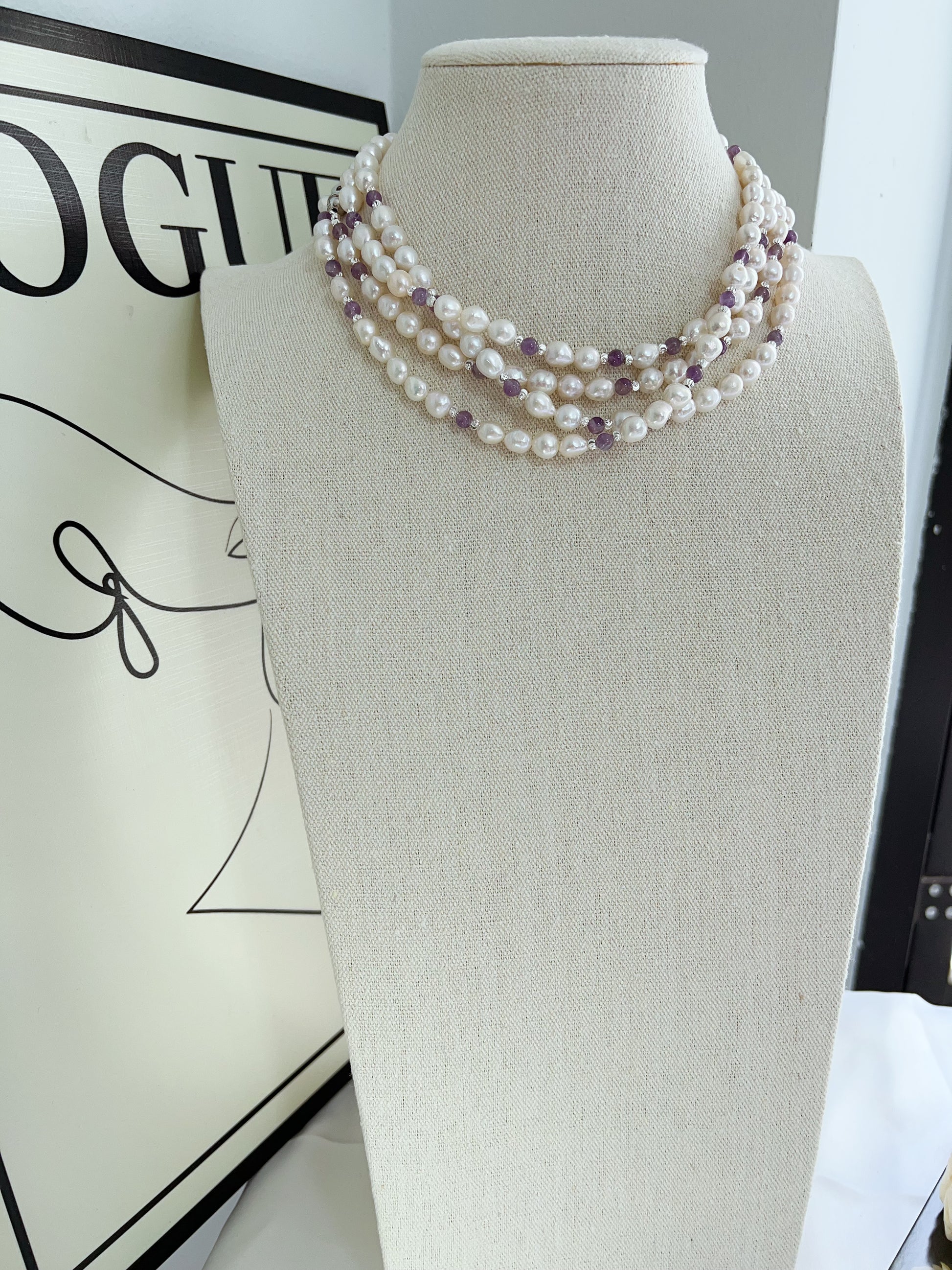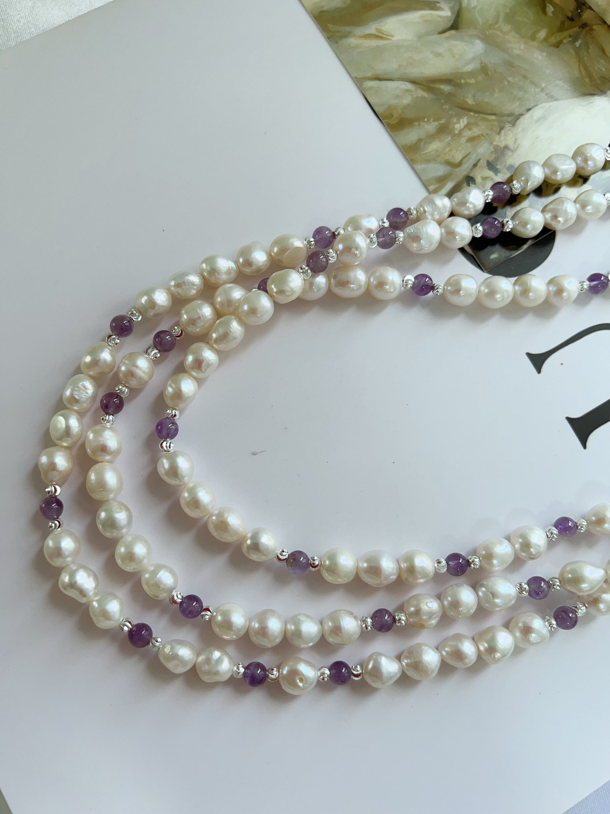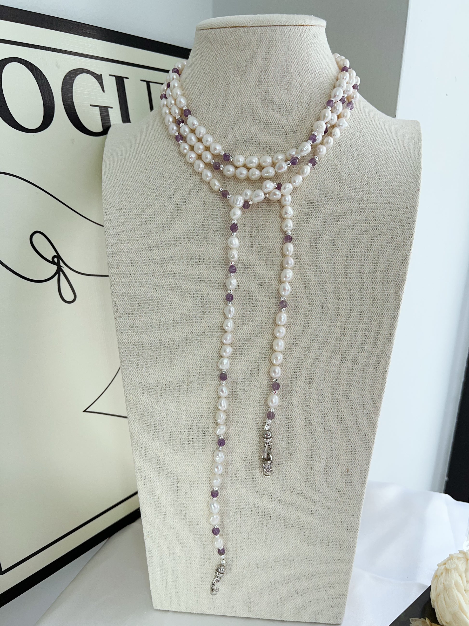#PN1232 freshwater pearl necklace 162cm super long lustrous small baroque pearl amethyst multiple way of wearing