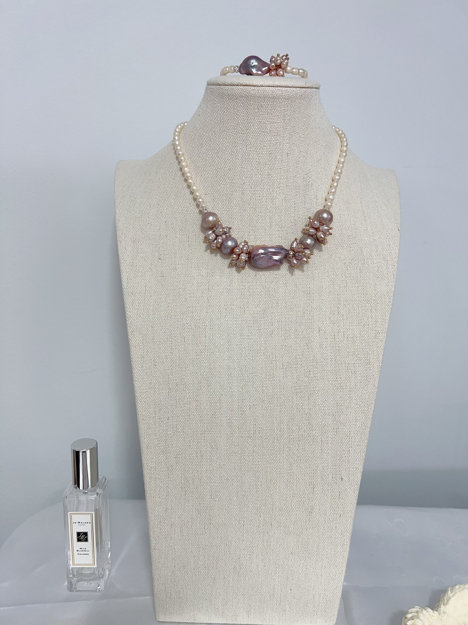 #PN1238 [Floral Series] freshwater pearl necklace & bracelet & earrings set 24mm purple fishtail baroque pearl chunky petals 12mm big pearls natural flaws