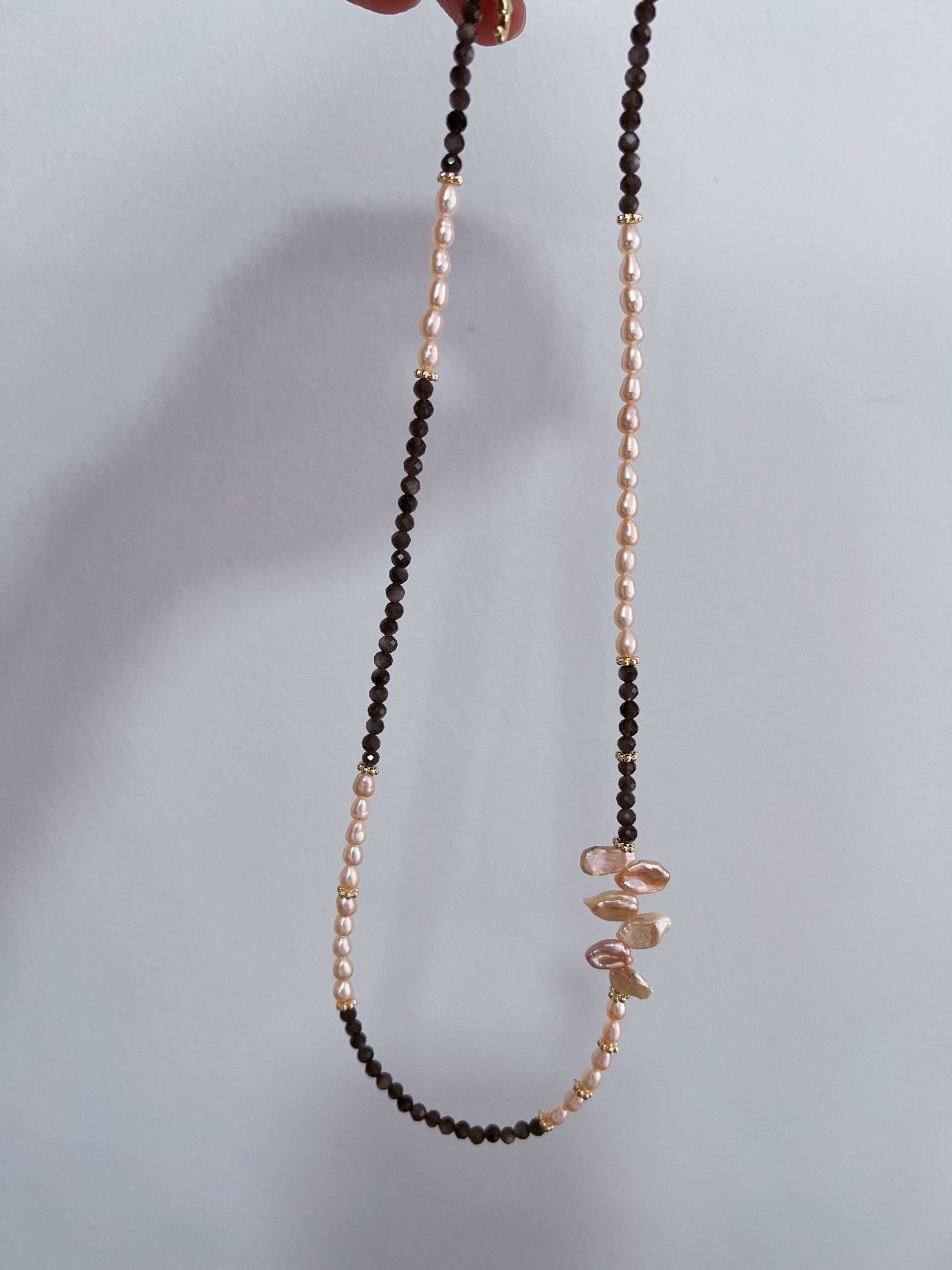 #PN1242 freshwater pearl necklace light gold rice pearl black spinel faceted lace design long petal pearl