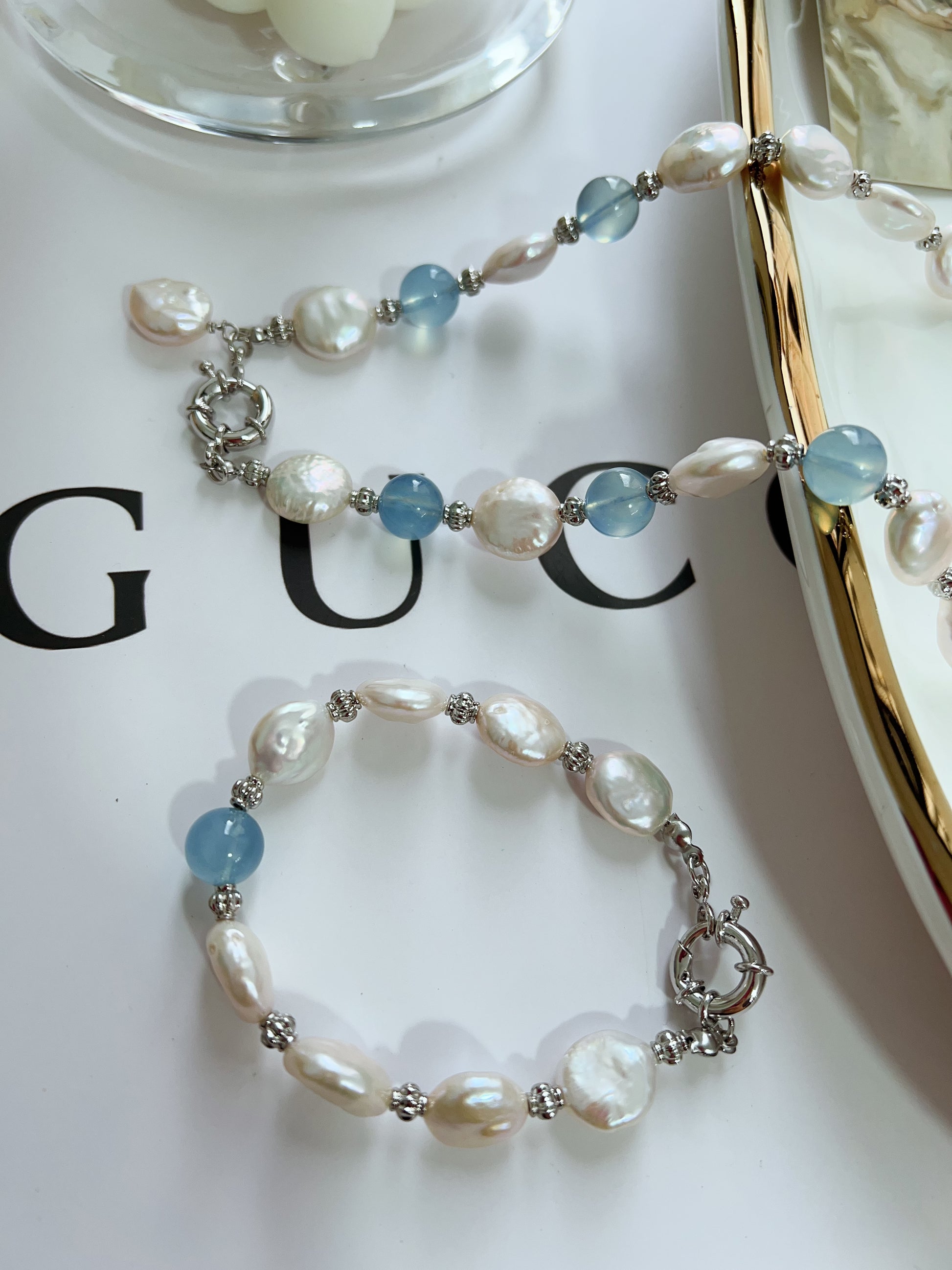 #PN1248 Freshwater Pearl Necklace & Bracelet Set Top tier Aquamarine Coin baroque pearls pendant Lustrous 48cm