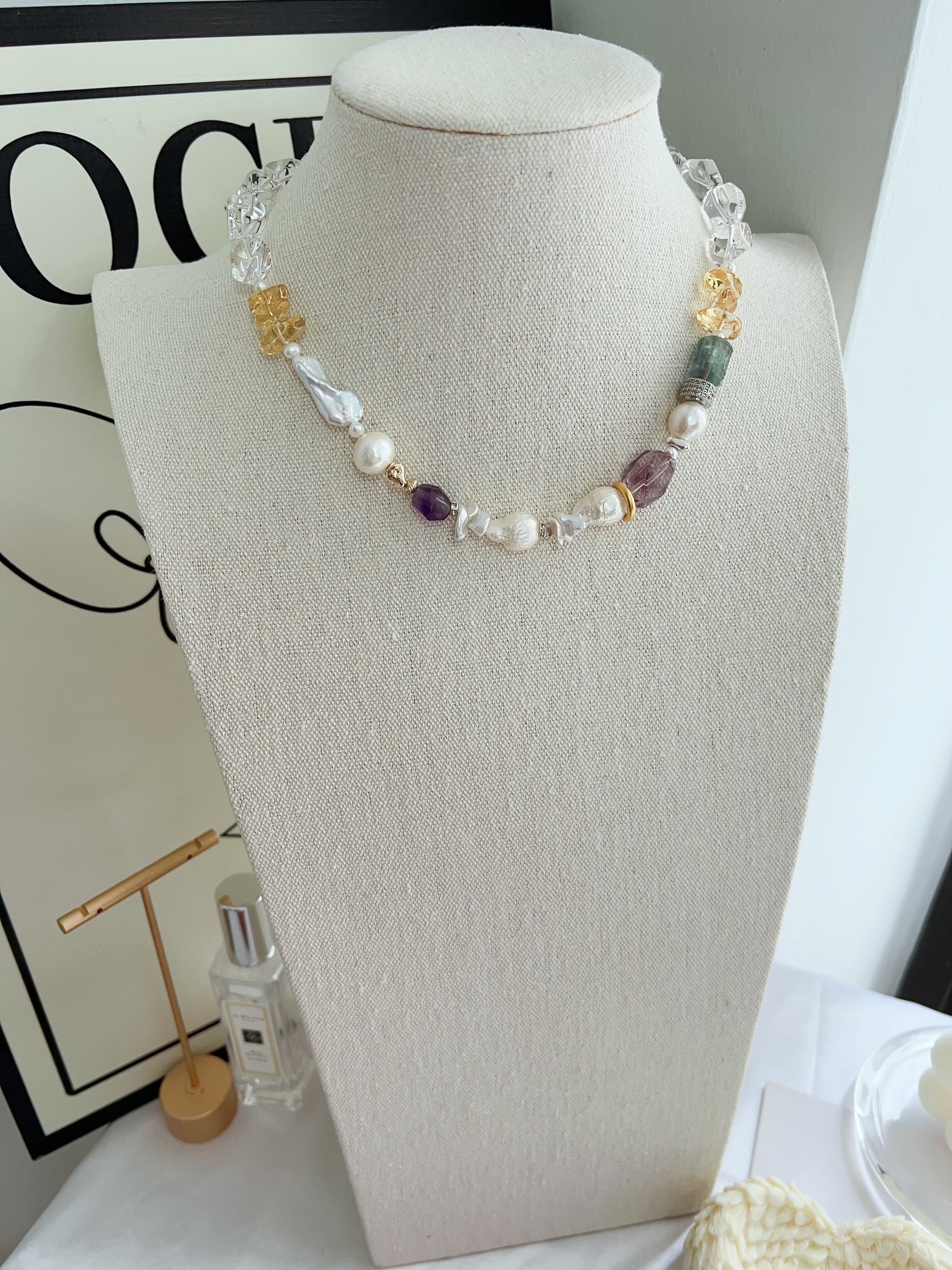 #PN1257 Freshwater pearl necklace 38+12cm clear quartz freeform carved fluorite amethyst irregular baroque