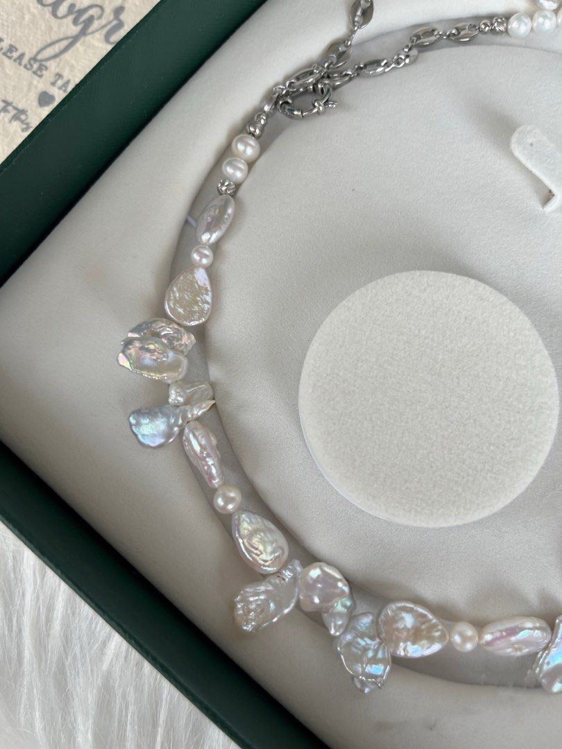 #PN448 Silver Petal|Freshwater Pearl Necklace |Long Chain|Water-drop Shaped Pearl |Silver Grey Lustre|Natural Flaws |63cm