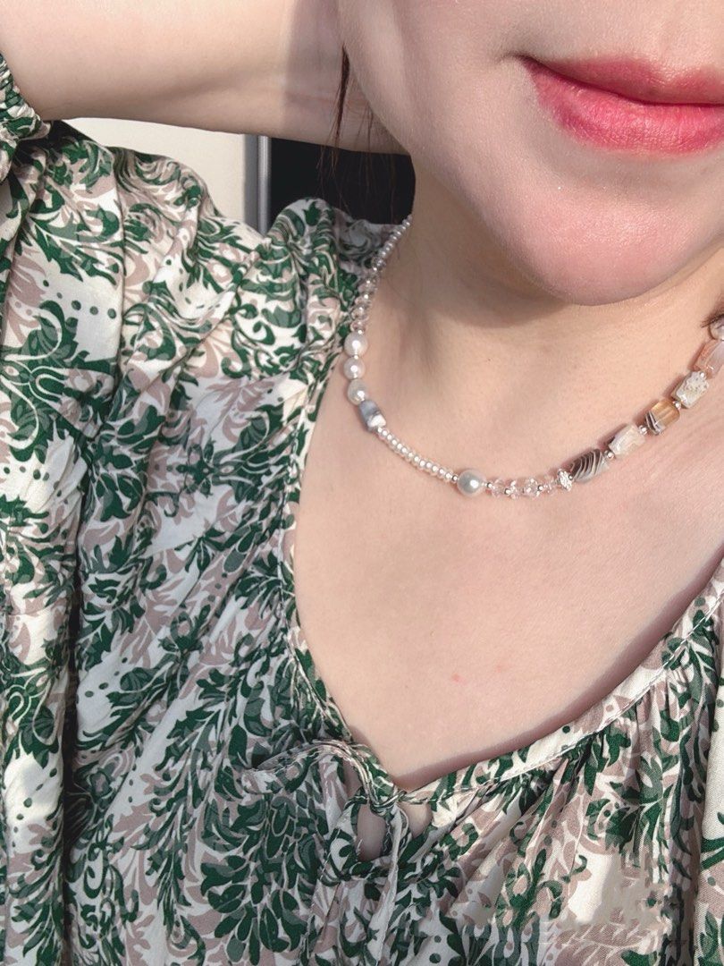 #PN490 Casual Chic| Freshwater Pearl Necklace | Patterned Agate| Lustrous Baroque Pearl |Baby Pearl | White Quartz