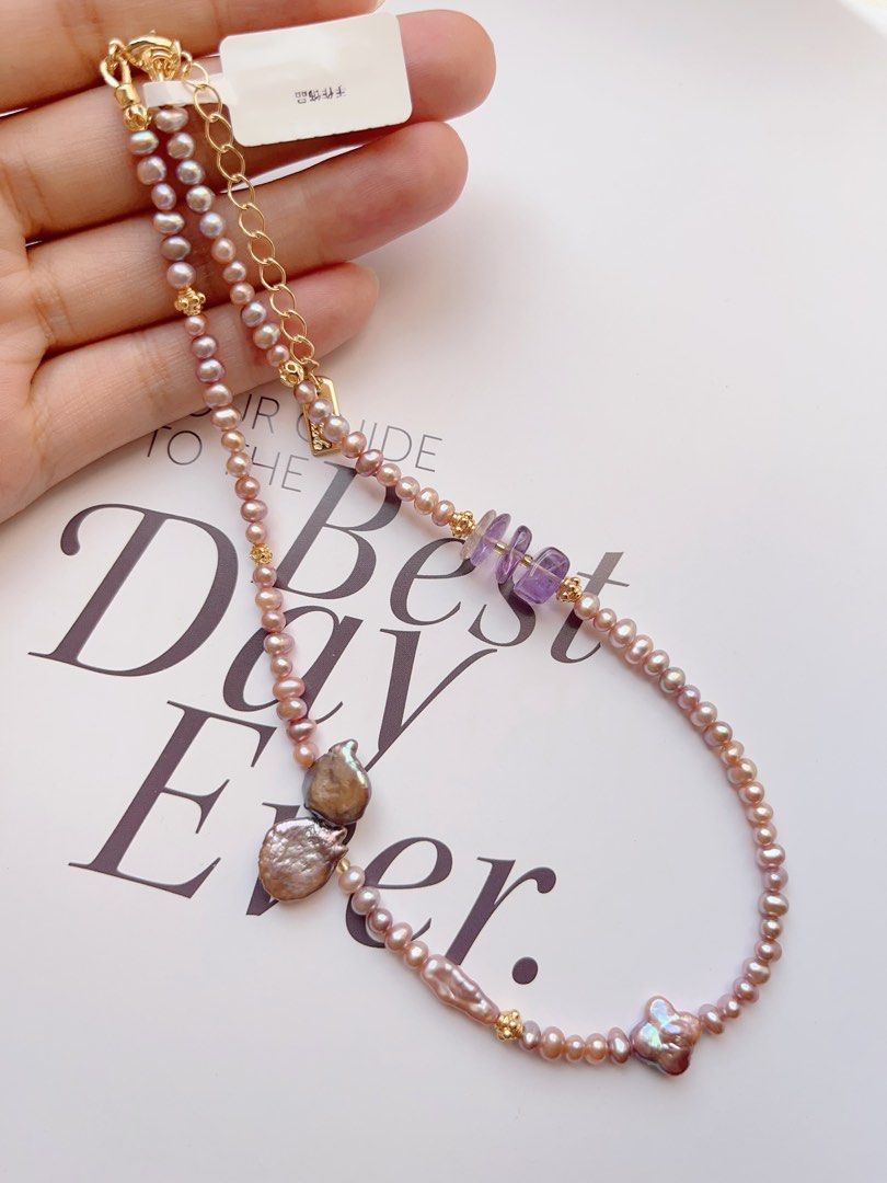 #PN500 Industrial Raw| Freshwater Pearl Necklace |Purple Quartz | Purple Baroque Pearl |Excellent Metallic Luster