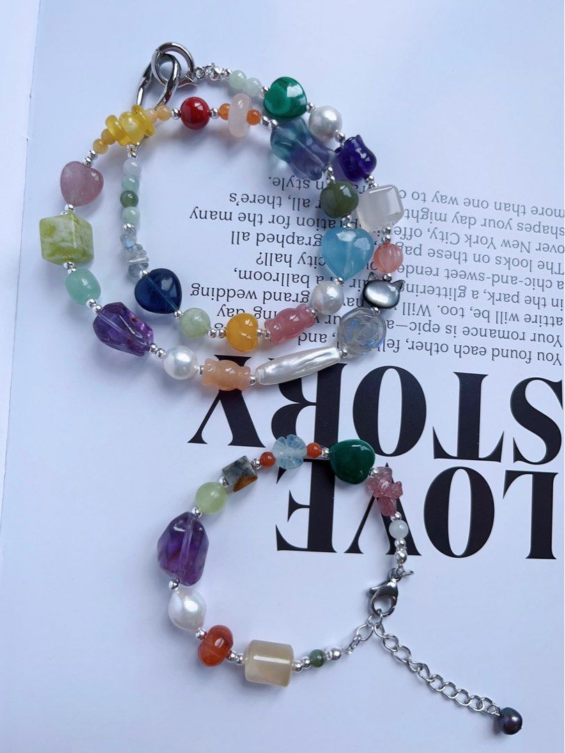 #PN593 [ChromaGems] Gems Garden|Freshwater Pearl & Gems Necklace & Bracelet Set|Pink, Purple Quartz |Malachite|Fluorite Rabbit|”Stick” Pearl |Jelly Agate|”Candy”, Blossom Agate|Moonstone Rose|Pumpkin Jade|Beeswax Flower|Heart Aquamarine