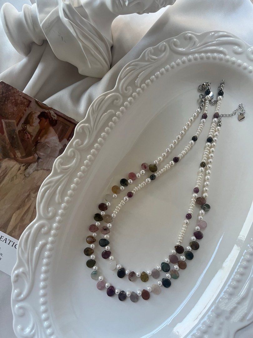 #1, Tourmaline & layered mini pearl necklace, 40+5cm;