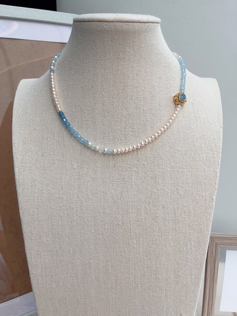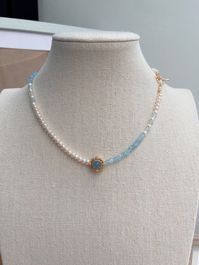 #PN662 Freshwater Baby Pearl & Faceted Aquamarine Square Necklace | Gradient Shades| Aquamarine Magic Box| Unique Design